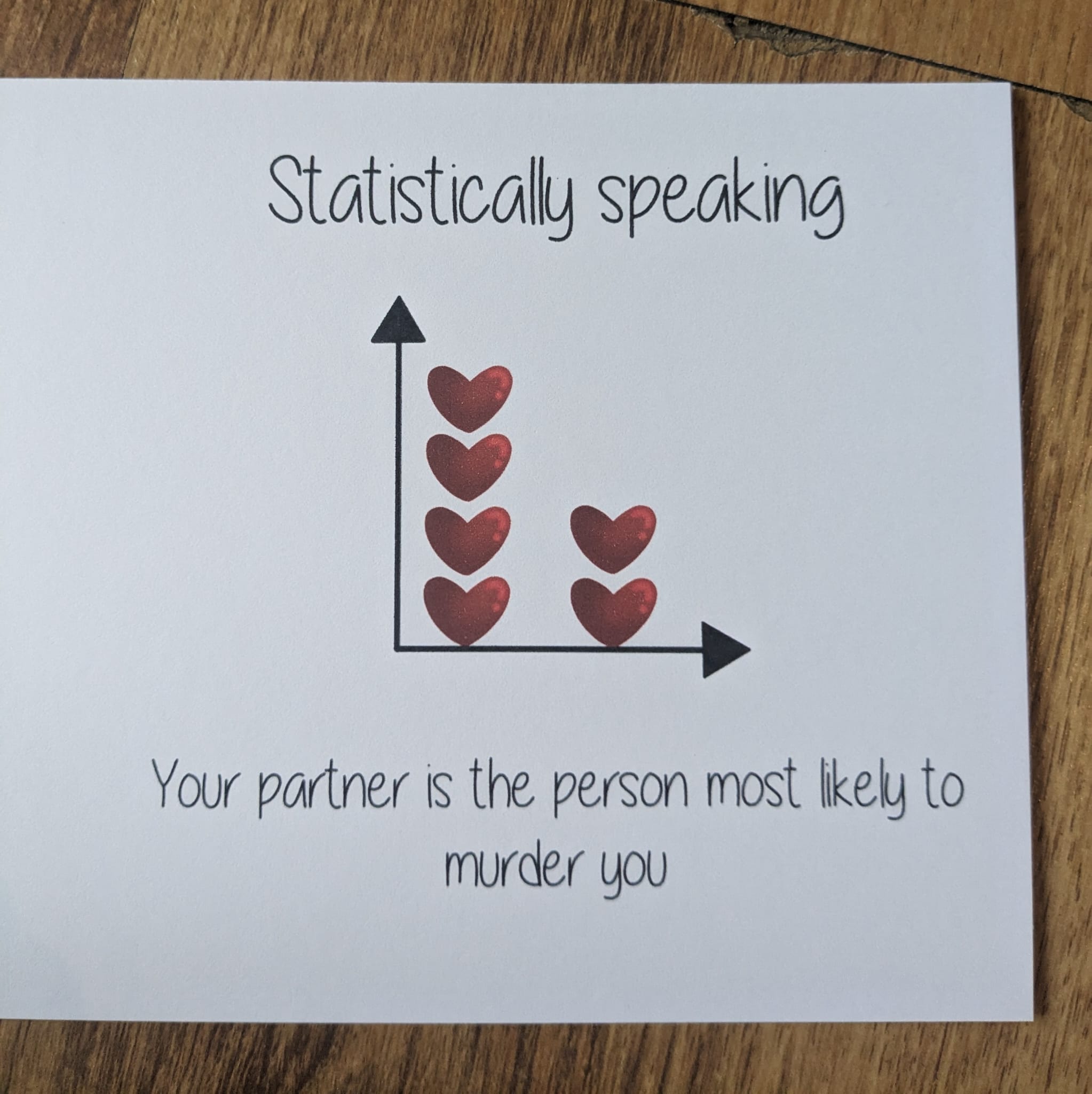 A hilariously morbid card for your beloved! Featuring a graph of hearts, it states: “Statistically speaking Your partner is the person most likely to murder you.” Perfect for anniversaries or Valentine’s for couples with a shared dark sense of humor