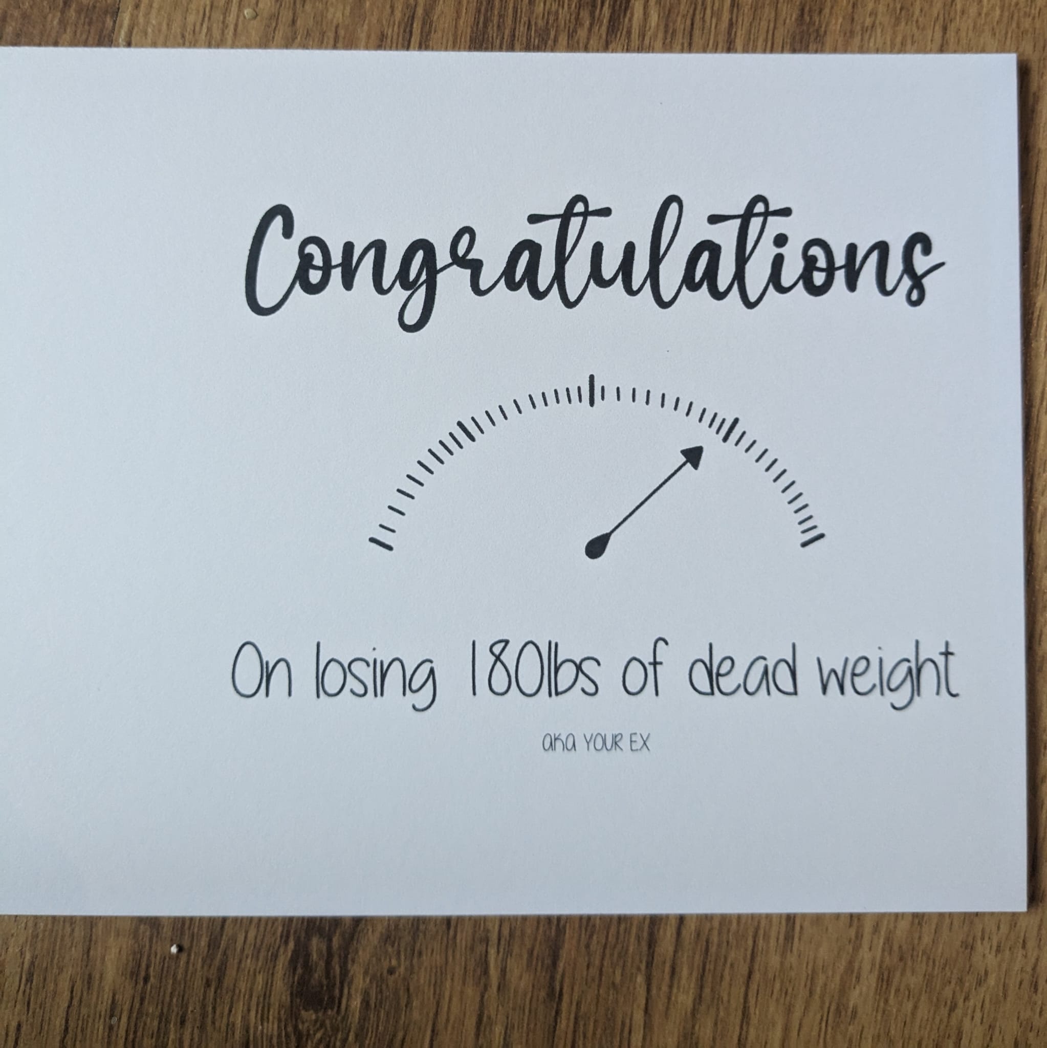Sarcastic breakup card: “Lost 180lbs of dead weight (your ex).”