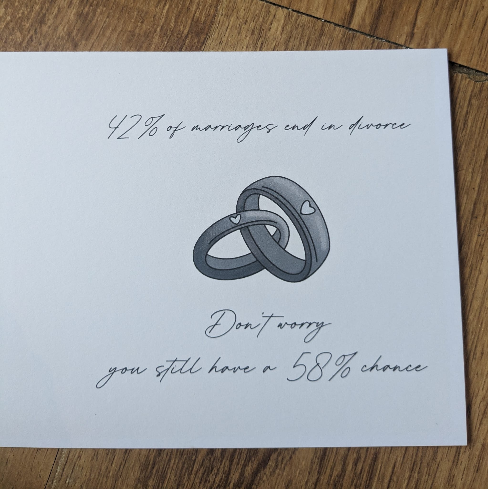 Congratulate newlyweds or anniversaries with a dose of statistical realism and dark humor! This card features wedding rings and the text: “42% of marriages end in divorce. Don’t worry you still have a 58% chance.” Ideal for couples with a cynical sense of humor who appreciate a good laugh about life’s realities.